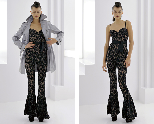 This black lace jumpsuit was part of her Fall 2011 collection. The neckline, bow, fabric and fit make the garment sexy-chic, but unfortunately the flared bell-bottoms take the look from couture to costume.