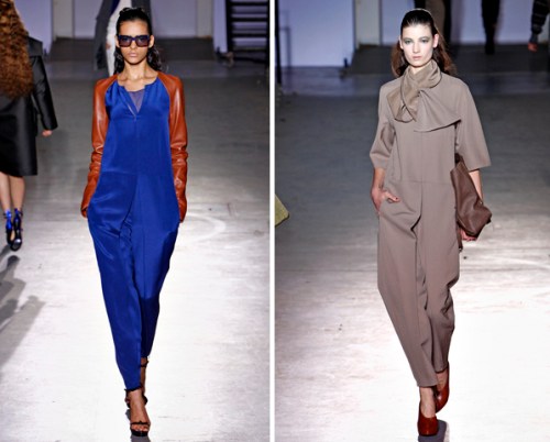Designer Phillip Lim showed these two jumpsuits with his Fall/Winter 2011 Ready-to-Wear collection last Wednesday at New York Fashion Week. His colour palette consisted of bright blues, lime greens and subdued neutrals, with some touches of burnt red. He drew his inspiration from the concept of fashion on two wheels. “It’s about these chic women who ride bikes to work, to brunch, to a cocktail party,” said Lim.