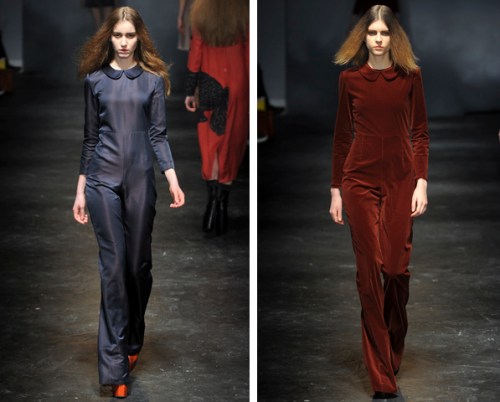 These two jumpsuits from his runway show share the same cut: flared bell-bottom pants, long, fitted sleeves and peter pan collars. The first gives off a futuristic vibe. It appears to be made from crepe or silk, and the dull but shiny blue colour allows one to classify it as evening-wear. The burnt red corduroy piece has more of a country (maybe just because the colour is reminiscent of a typical barn!) look, however seems more wearable as day-wear… but with the right accessories it too can be worn at night.