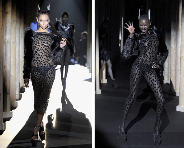 However, Formichetti didn’t need Gaga to make his runway show a success. The vampy models did justice to his bold, intricate and sometimes vulgar designs. These two bodysuits encompass two design elements that could in fact speak for his entire collection: skin-tight and sheer. He uses the popular cheetah print in black, and combines it with fur sleeves to create a truly animalistic look. Perhaps at next year’s Grammy Awards, Nicki Minaj will arrive on the red carpet in a sleek Mugler cheetah-printed bodysuit– a step up from the Givenchy disaster she showed up in this year.