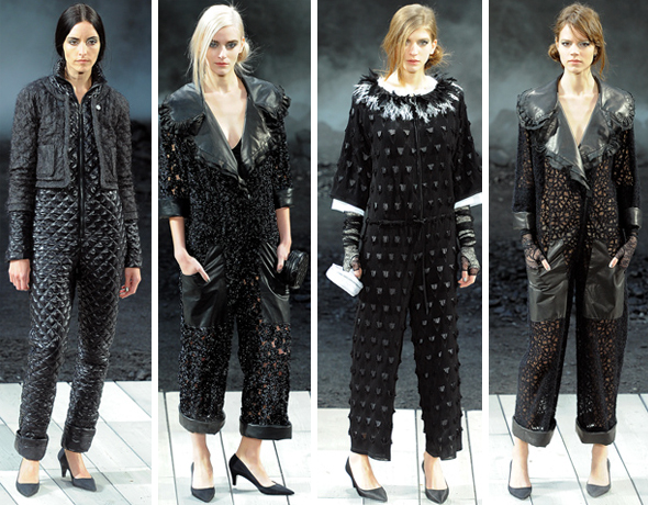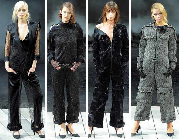 Karl Lagerfeld’s Fall/Winter 2011 Ready-to-Wear collection for Chanel was shown yesterday at Paris Fashion Week. The overall theme of his runway show appeared to be Parisian glamour meets grunge fantasy, meets the Wizard of Oz. Though he provided audience members with his signature separates, Lagerfeld unpredictably sent a great number of jumpsuits down the runway. Of course, these were nothing like the jumpsuits that were shown by other designers at the fashion weeks in New York in Europe, with gathered pants, wrapped necks, or bold prints. Lagerfeld’s jumpsuits were clearly chanel-ified…