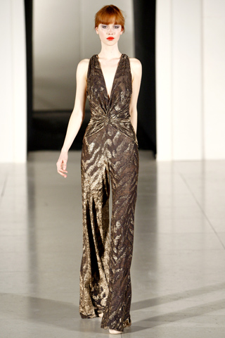 Temperley combines a retro design with a bold, glittering gold and brown print to create this jumpsuit, suitable for both evening-wear and perhaps a night out at a lavish lounge. In many ways, the cut of this garment is very similar to a Topshop Unique design shown the same day in London.