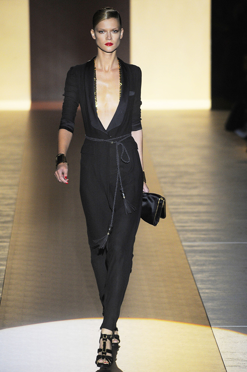The jumpsuit is from the Gucci Spring 2011 RTW collection. Here’s how it looked on the runway in Milan: