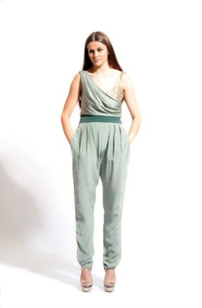 Wafa’s Plié Poise Collection is sensual, feminine, youthful and elegant. Her Autumn/Winter 2011 garments feature beautiful draping, skirts with volume, intricately cut-out backs and lush shades of green, along with black sparkling embellishments and chiffon accents. This jumpsuit is available in light pastel green colour with a darker olive-green belt. The piece combines a one-shoulder top draped delicately over a glimmer of gold, with pants that fall gracefully and effortlessly. The jumpsuit is glamorous and formal, but still looks comfortable and easy to wear!
