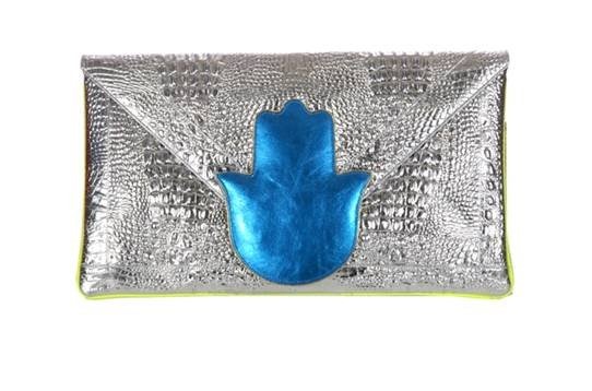 The oversized Fatima clutch is available in blue and pink, and is set against real leather, in a silver shade and metallic fabric treatment. The blue clutch is 26cm x 44cm, and costs US$306 (AED 1127)