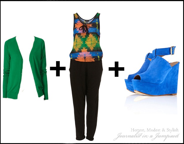 Shop the high street and sport two of the most popular trends of Spring/Summer 2011 by pairing this Aztec print Jumpsuit from Topshop (US$70/AED257) with a green cardigan from Zara (US$12/AED55) and Walberg by Topshop blue suede ankle strap platform wedges (US$140/AED514).