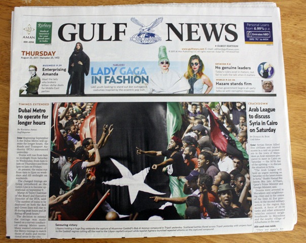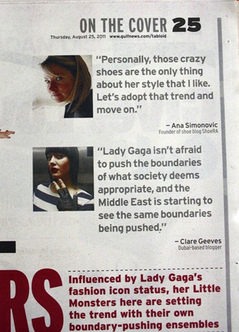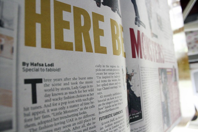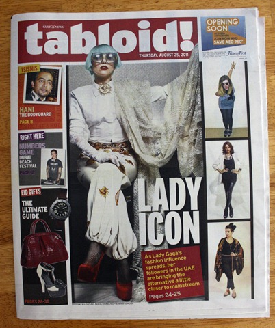 My first feature story was published today in Dubai, and it made the cover of Gulf News tabloid! The article is about Lady Gaga, and how her iconic fashion influence is interpreted in the UAE.