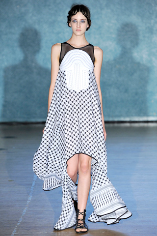 I try to avoid regurgitating runway reviews on my blog during fashion weeks, but as an aspiring journalist who divides her year between the Eastern and Western hemispheres, I had to write a post about a collection that really caught my attention. In what may have been a tribute to the ongoing conflict between Israel and Palestine, NYC fashion label Threeasfour combined icons, emblems, embellishments and fabrics found in the Middle East, with modern and more Western silhouettes and styles, in their Spring/Summer 2012 runway presentation earlier today.