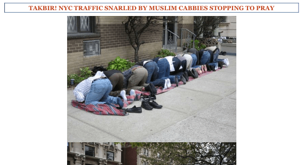 The headline of Pamela Geller’s latest blog post reads “Takbir! NYC Traffic Snarled By Muslim Cabbies Stopping To Pray.”