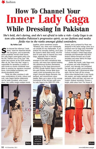 By now, you all must know how much I love to discuss Lady Gaga when I write about how fashion trends in the West translate into style in the East. A few months ago, I wrote a feature about her “Little Monsters” in Dubai for Gulf News tabloid, and this week, my piece about her fashion influence in Pakistan was published in Sunday Magazine, Pakistan’s weekly fashion magazine, distributed with the Daily Times newspaper.
