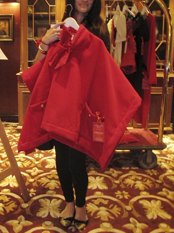On Monday, Karolina, in association with The Fashion Network, Savoir Flair and United Designers, displayed her new “Merry Christmas” collection at the Ritz Carlton in Dubai. Red and white, with her signature ruffles and holiday-themed bows, the collection was adorably chic and fashionably festive. As I had just arrived in Dubai from Toronto (where I’ve been wearing my black fur-lined cape like it’s my security blanket), I was still in the mindset of snowflakes and cider, and headed straight to the beautiful red cape hanging on the Poca & Poca rack. It reminded me of Little Red Riding Hood, and was so soft, complete with pockets and a bow tied at the neck! Winter-wear lovers and fantasy story dwellers, this cape is a must-have, and can be purchased exclusively at the United Designers store in Mirdif City Centre.