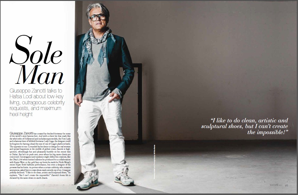 I had the pleasure of meeting shoe extraordinaire Giuseppe Zanotti when he was in Dubai last month for an interview with Velvet Magazine. It was held at the Jumeirah Zabeel Saray hotel on the Palm, and though we were in the C Club – a lavishly decorated gold room, he was extremely down to earth and preferred being photographed in a grey storage room nearby. The photographer, Atif Abu-Samra was amazing, and the interview and shoot were both a lot of fun. Read the feature in this month’s issue of Velvet Magazine: